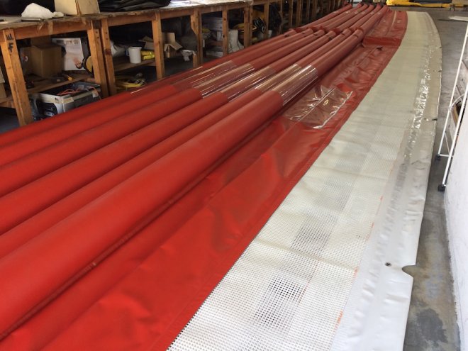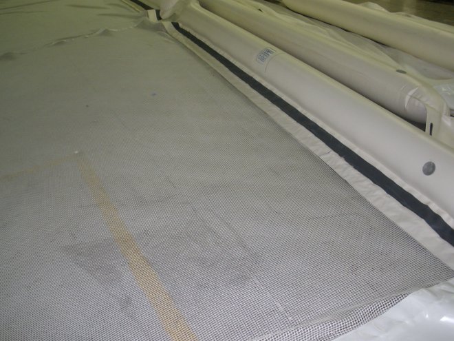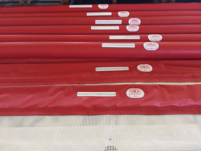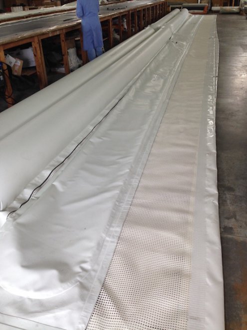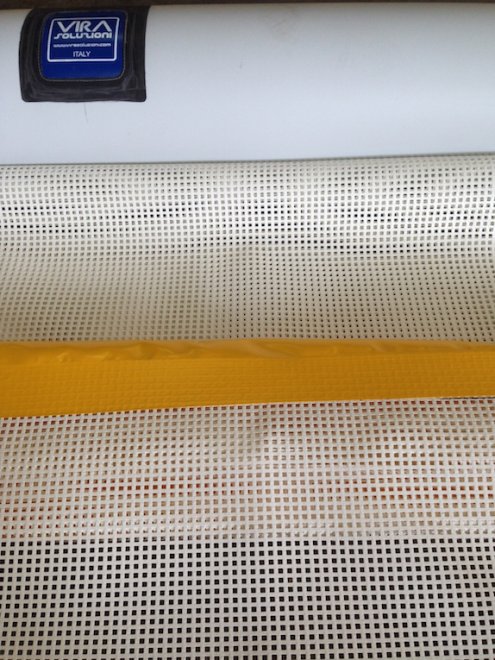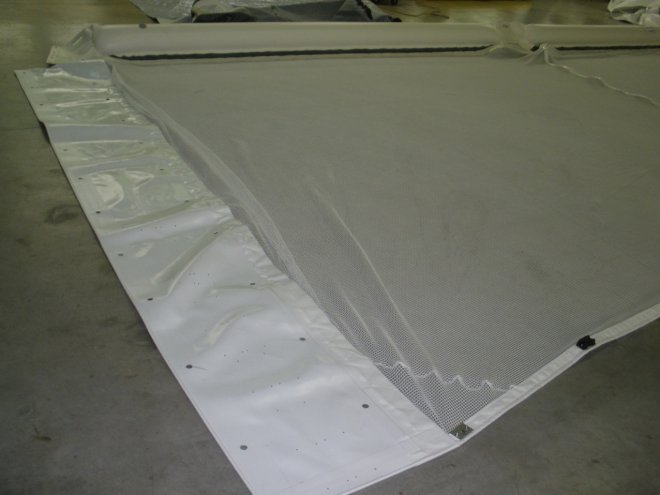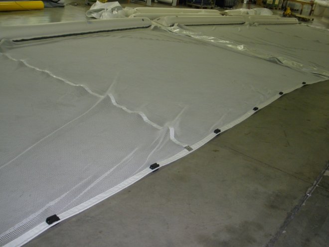 tessuto gommato, terminali e piastre in acciaio inox, grembiuli personalizzabili con rete a maglia fine (0,5mm) o larga (5cm) per diverse capacità di filtro, la rete immersa può essere inoltre di due tipi, morbida e semirigida anti impiglio per garantire la sicurezza dei bagnanti e della fauna marina.